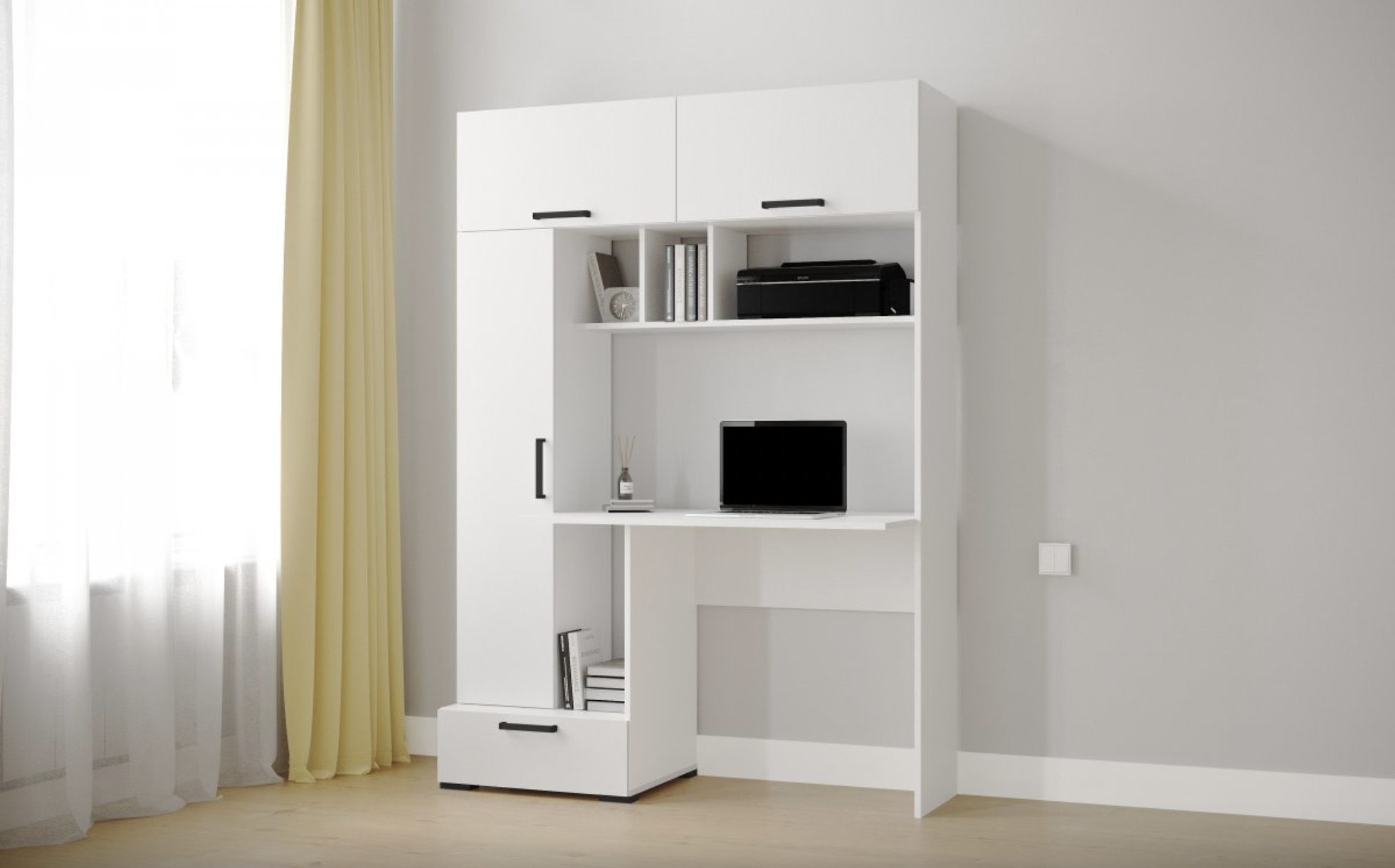 Компьютерный стол Квартет-11 белого цвета — это  удобное и стильное решение для рабочего места. Размеры стола составляют  (ВхШхГ) 1850 х 1316 х 600 мм, что позволяет комфортно разместить всё  необходимое для работы. Стол изготовлен из ЛДСП, отличающегося  прочностью и долговечностью. Расположение стеллажа соответствует  изображению на фото, обеспечивая оптимальный порядок на рабочем месте.  Стол Квартет-11 станет прекрасным дополнением к интерьеру и поможет  организовать рабочее пространство.