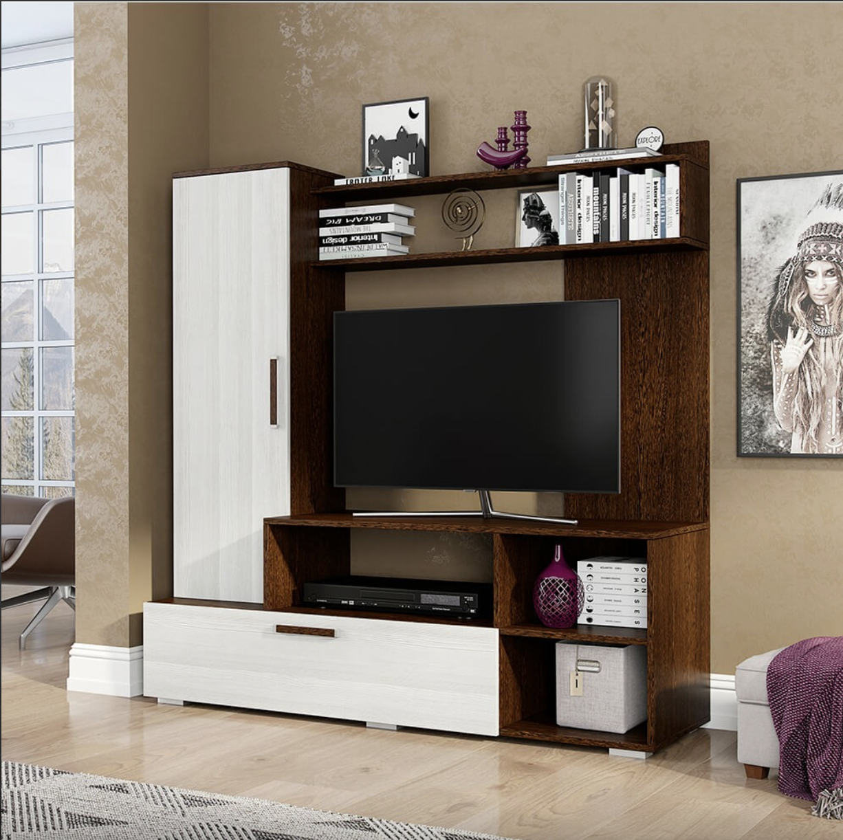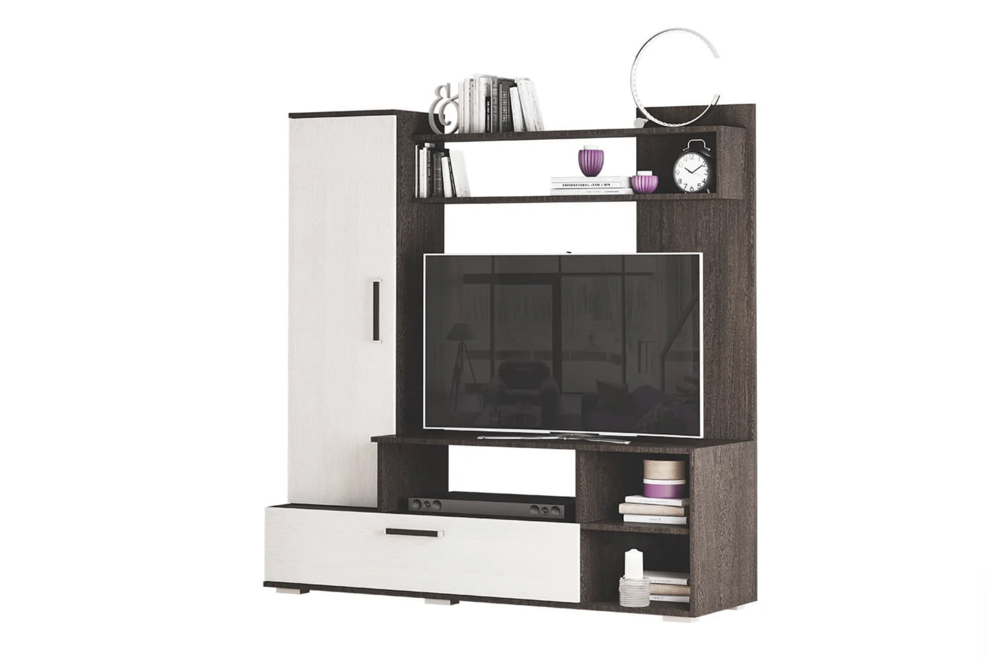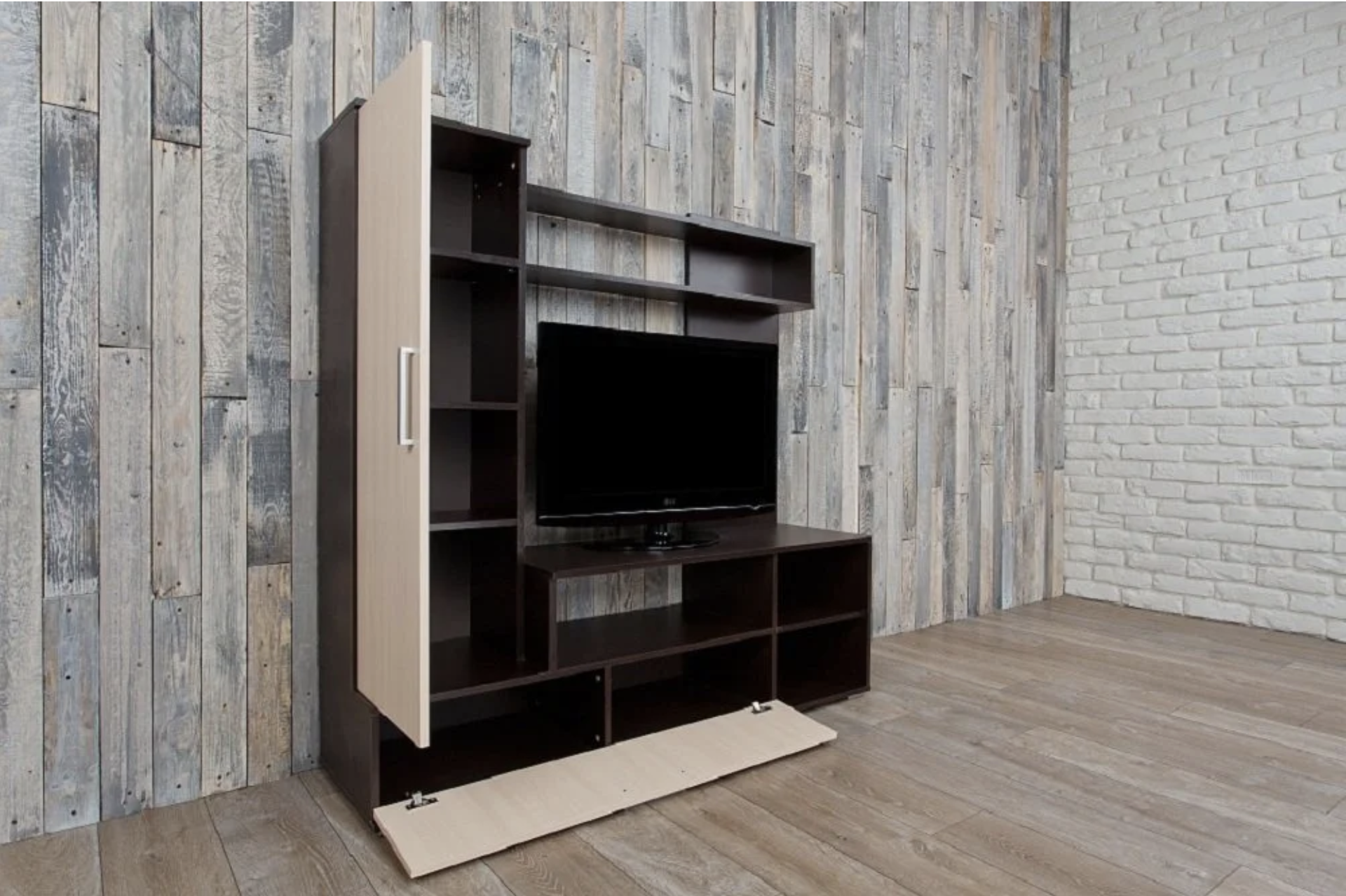 Размеры: ширина - 150 см, глубина - 44 см, высота - 152 см. Гостиная имеет нишу под ТВ размерами 1110 х 828 х 432 мм. Цвет: корпус - венге, фасад - лоредо (как на картинке). Материал: ЛДСП. Технические характеристики: Гостиная состоит из: ТВ-тумбы с ящиком и открытыми нишами, однодверного шкафа и двух полок для книг. Поставляется в разобранном виде. Объём: 0,34 м3.