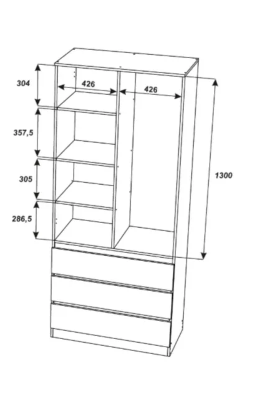 Шкаф Мори МШ 900.1 - современный распашной шкаф для одежды и белья. Внутреннее пространство шкафа разделено на две части и скрывается двумя дверьми. Одна часть с тремя полками для белья, вторая со штангой для хранения одежды на плечиках. В нижней части шкафа размещены два выдвижных ящика на роликовых направляющих.